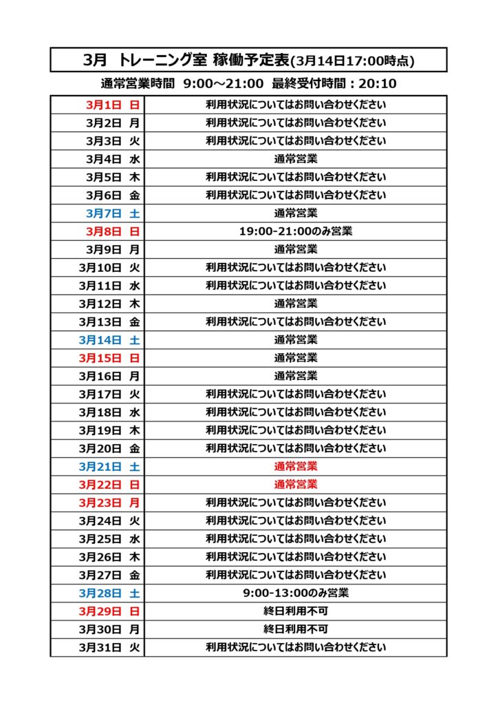 3月トレーニング室稼働予定について※3月14日更新