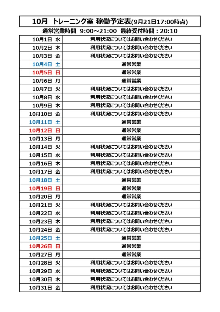 10月トレーニング室稼働予定について 2025年9月21日 最終更新日時 : 2025年9月21日 takigashira 2025年10月の予定表は以下の通りとなります。※ご利用方法等についてはこちらからご確認下さい
