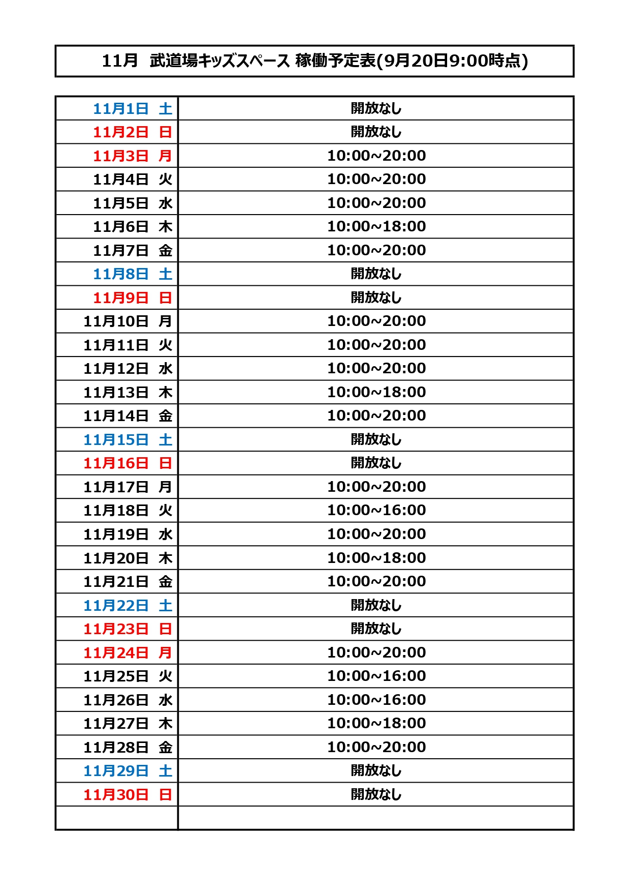 11月武道場キッズスペース開放稼働予定について 2025年10月20日 最終更新日時 : 2025年10月19日 takigashira 2025年11月の予定表は以下の通りとなります。※ご利用方法等についてはこちらからご確認下さい