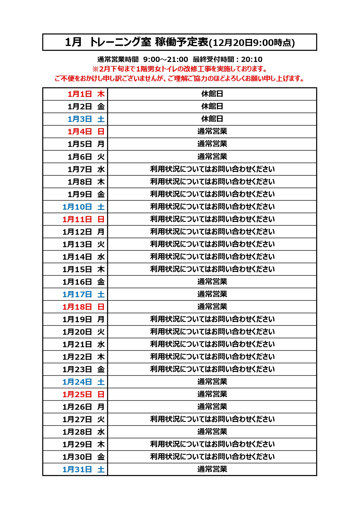 1月トレーニング室稼働予定について 2025年12月20日 最終更新日時 : 2025年12月20日 takigashira 2026年1月の予定表は以下の通りとなります。※ご利用方法等についてはこちらからご確認下さい