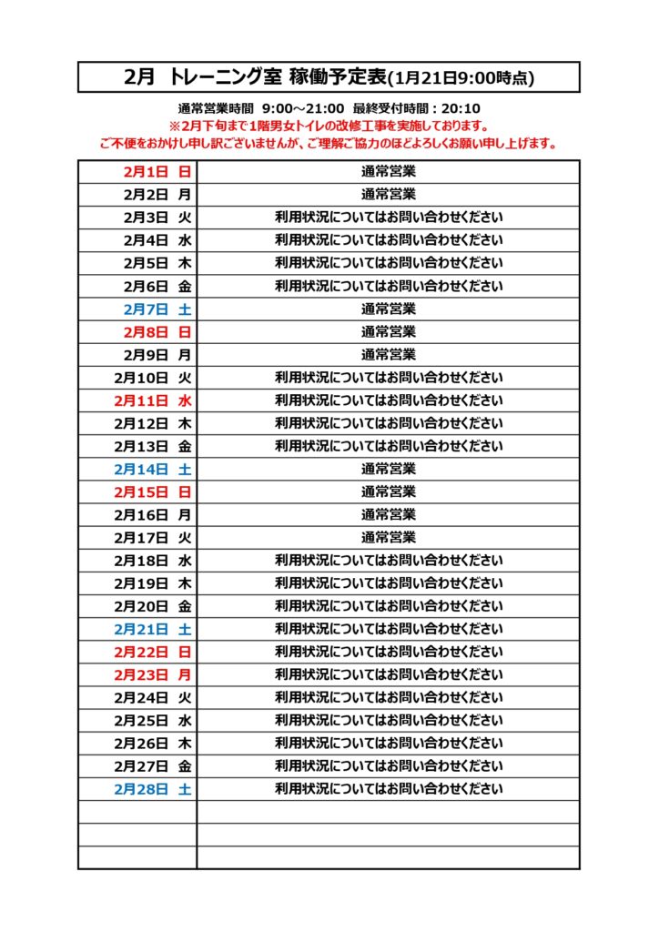 2月トレーニング室稼働予定について 2026年1月21日 最終更新日時 : 2026年1月21日 takigashira 2026年2月の予定表は以下の通りとなります。※ご利用方法等についてはこちらからご確認下さい
