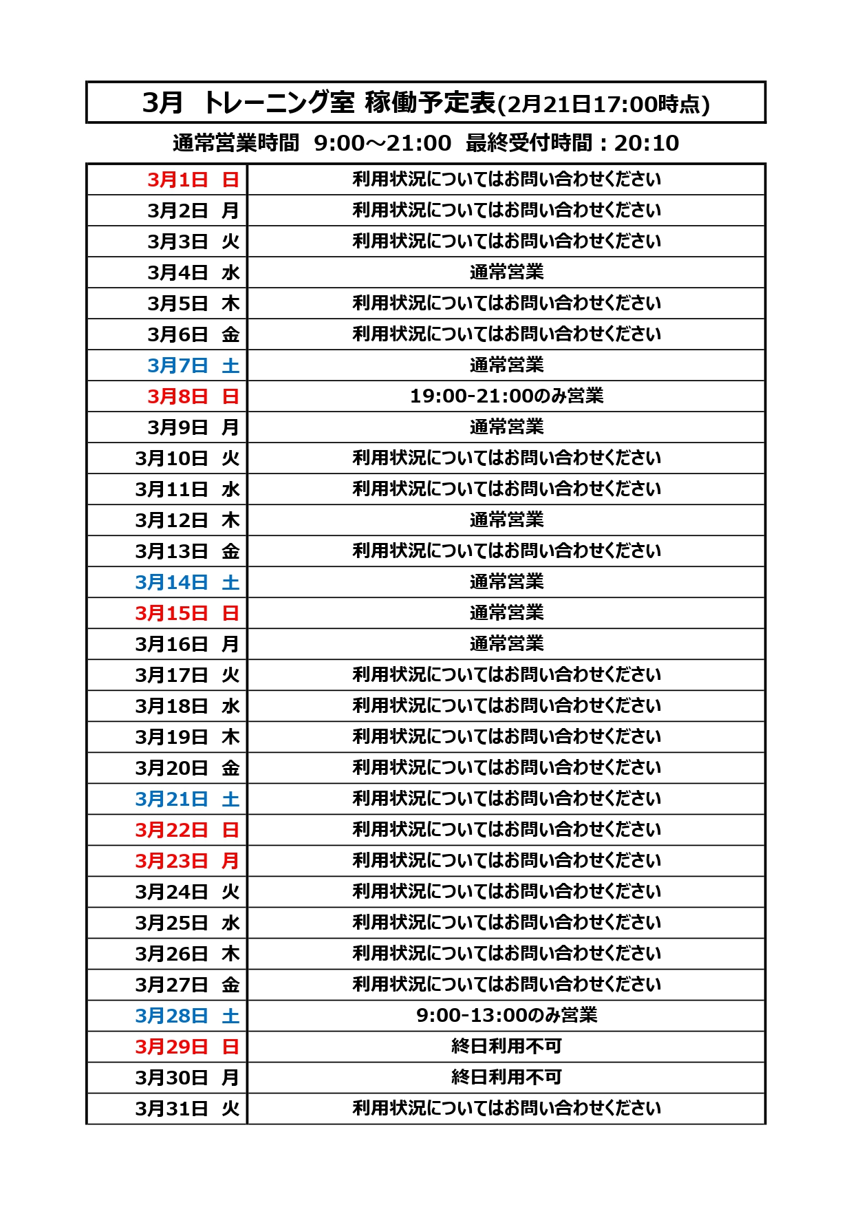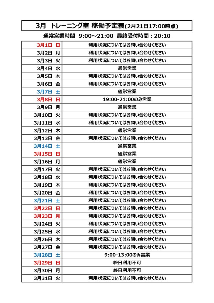 3月トレーニング室稼働予定について 2026年2月21日 最終更新日時 : 2026年2月21日 takigashira 2026年3月の予定表は以下の通りとなります。※ご利用方法等についてはこちらからご確認下さい