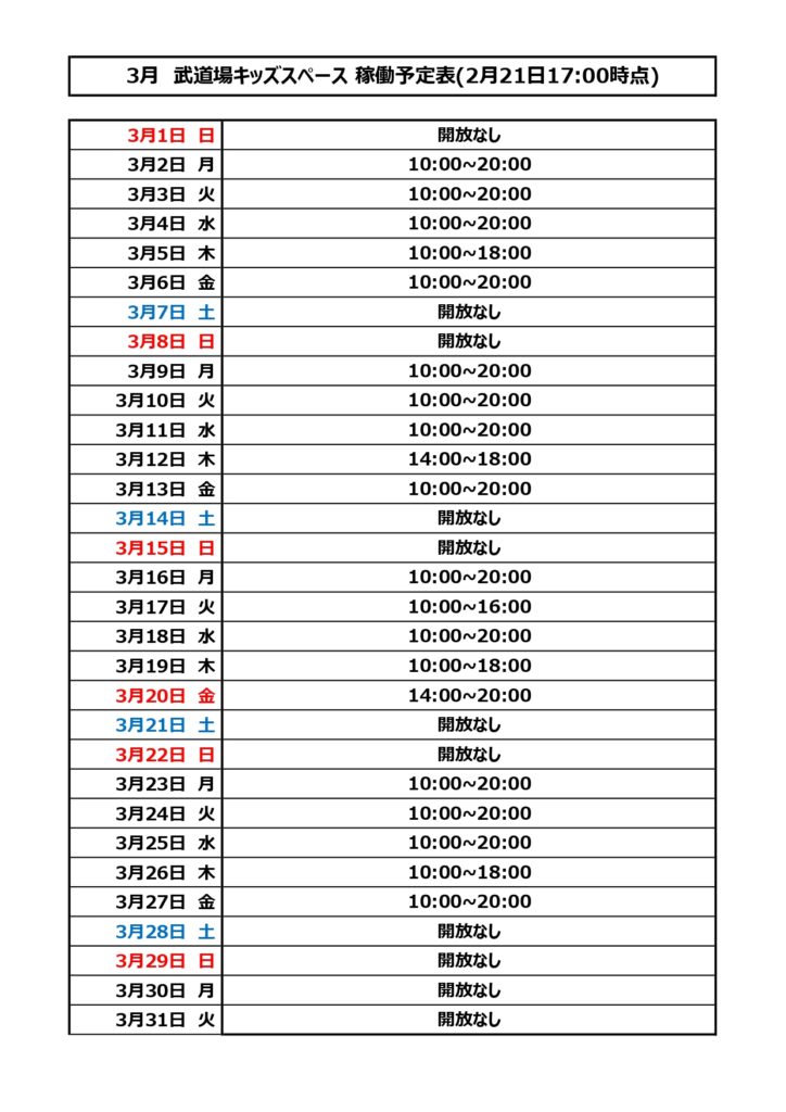 3月武道場キッズスペース開放稼働予定について 2026年2月21日 最終更新日時 : 2026年2月21日 takigashira 2026年3月の予定表は以下の通りとなります。※ご利用方法等についてはこちらからご確認下さい