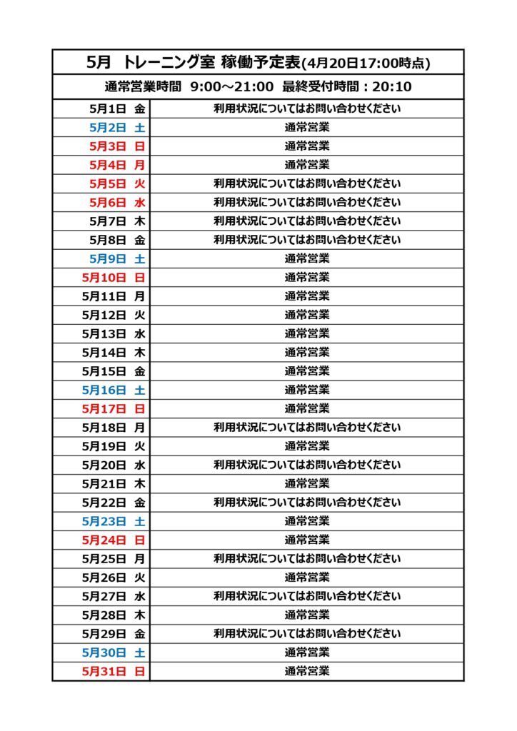 5月トレーニング室稼働予定について 2026年4月20日 最終更新日時 : 2026年4月20日 takigashira 2026年5月の予定表は以下の通りとなります。※ご利用方法等についてはこちらからご確認下さい