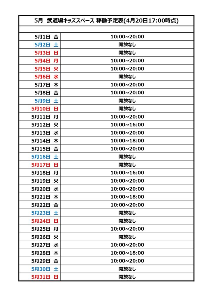 5月武道場キッズスペース開放稼働予定について 2026年4月20日 最終更新日時 : 2026年4月20日 takigashira 2026年5月の予定表は以下の通りとなります。※ご利用方法等についてはこちらからご確認下さい